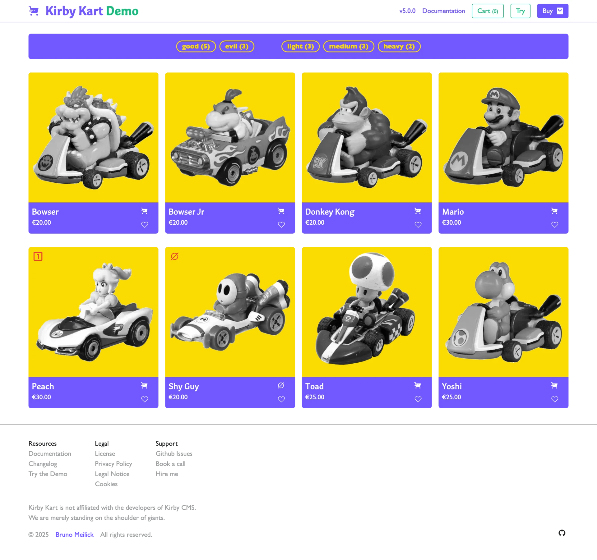 You can browse the demo to see most of the features in action. But please remember that Kirby Kart is at its core not a theme, and your website can look and behave differently from the demo.